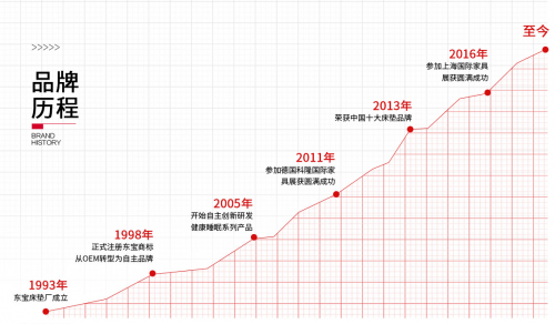 東寶床墊成立于中國東莞家具之都厚街,在90年代的創(chuàng)業(yè)潮流中,東寶床墊是中國第一批床墊品牌。起初,東寶床墊是從制造廠起步的,這也為床墊品牌建立后的質(zhì)量控制奠定了良好的基礎(chǔ)。東寶無疑是床墊制造業(yè)的領(lǐng)導(dǎo)者,因為它在床墊制造過程中的熟悉和成熟。后來東寶開始研發(fā)自己的床墊品牌,大膽開發(fā)高端領(lǐng)域,開發(fā)了臥皇寢具和凱蒙寢具兩大品牌,使東寶的品牌活力得以持續(xù)發(fā)展。