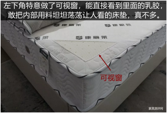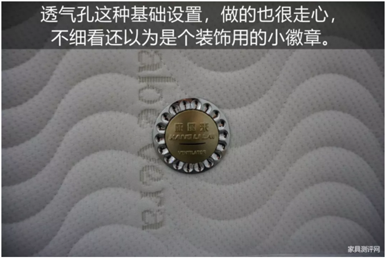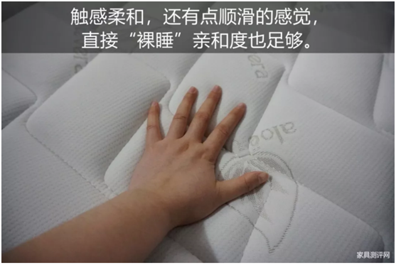 左下角還特意做了一個可視窗,可以直接看得到里面打了孔的乳膠,內部用料坦坦蕩蕩的放出來讓人看。床墊表層用了蘆薈面料,有很強的吸濕和放濕性,容易讓皮膚保持滋潤狀態。