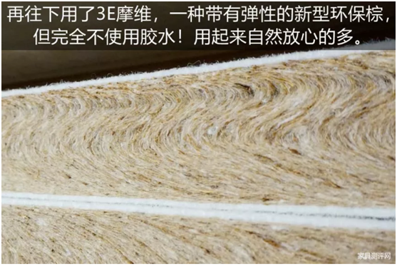 亮點來了!乳膠下用了3E摩維,一種帶有彈性的新型環保棕。但這里完全不使用膠水!直接通過高溫熱壓的方式,將所有材質壓在一起。避免了傳統椰棕墊的環保隱患,用起來放心得多。