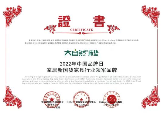 大自然床墊不負(fù)眾望,繼2020、2021年之后,第三次榮膺家居新國貨家具行業(yè)領(lǐng)軍品牌的稱號。
