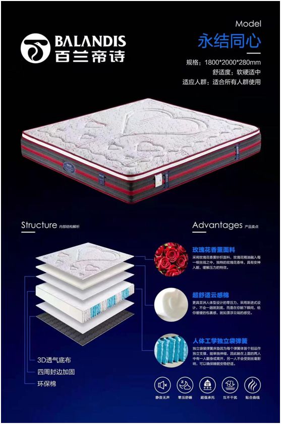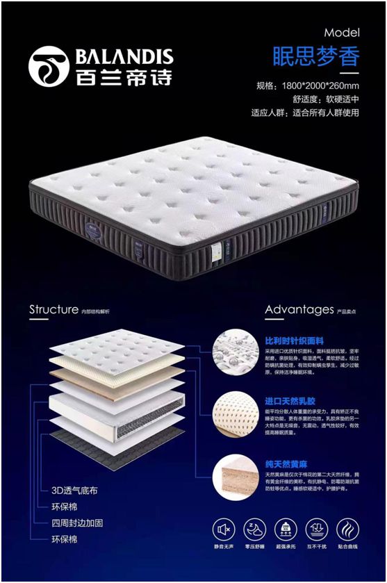 百蘭帝詩家居是一個極具創(chuàng)造力和創(chuàng)新能力的企業(yè),創(chuàng)新是深入骨髓的企業(yè)基因,每一個百蘭帝詩人都有非常強的創(chuàng)造力和創(chuàng)新力。百蘭帝詩人非常注重產(chǎn)品的設(shè)計風(fēng)格、款式及品牌的獨特性,融合古典與前衛(wèi)、現(xiàn)代與時尚、生活與情趣,旨在用全新的設(shè)計思維和以人為本的理念去打造生活的藝術(shù)。2022年,百蘭帝詩家居推出的眠思夢鄉(xiāng)系列,就是針對深睡眠的5大維度優(yōu)勢(貼合感、接觸柔軟感、適溫感、干爽感、安全感),精選比利時針織面料、進(jìn)口天然乳膠、純天然黃麻等原材料制作形成全方位的零感深睡體驗,倡導(dǎo)人們回歸睡眠本質(zhì),讓身體得到大滿足。