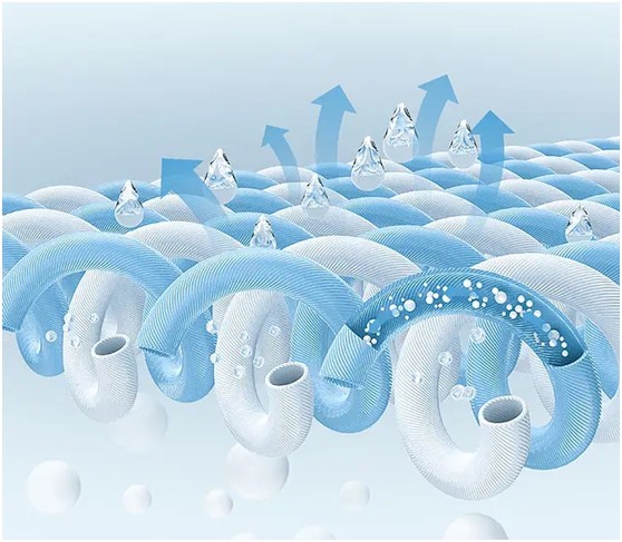 它通過獨(dú)特的四孔纖維結(jié)構(gòu),構(gòu)建出水汽循環(huán)對流,四面環(huán)氧,舒爽透氣。并且經(jīng)過COOLFX技術(shù)處理,利用纖維的溝槽產(chǎn)生虹吸作用,可以帶動肌膚表面的水分快速擴(kuò)散,吸收汗液水分,排濕散熱速度更快,促進(jìn)人體自然的溫度調(diào)節(jié),使肌膚始終保持干爽舒適。