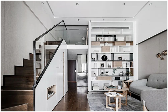 沙發對面的電視墻被簡鉆家居巧妙設計為樓梯,后方空間都做成收納柜,樓梯、收納兩不誤,保持簡潔大方的基礎,又提升了空間的儲物功能。而沙發旁邊的墻面做成書架,擺上書籍、陶藝品和金屬擺件,提升了空間的藝術與精致感。