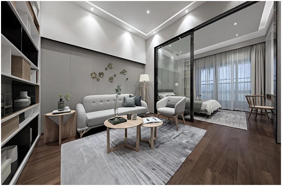 雖說是小戶型,但五臟俱全,應有盡有。灰色主色調令空間別有一番風情。移步客廳,整體地面以木地板的設計,天花采取無主燈的吊頂設計,讓小空間也顯得格外的寬闊大氣。客廳與臥室之間僅以室內推拉門的設計加以阻隔,增加寬敞大氣的空間感。