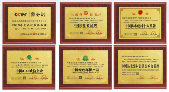 蒙必諾建材自2017年成立至今,經(jīng)過短短幾年的快速發(fā)展,已發(fā)展成為一家集研發(fā)、生產(chǎn)、銷售于一身的家裝輔材一站式服務(wù)體系的企業(yè),其產(chǎn)品通過多項國家權(quán)威機(jī)構(gòu)認(rèn)證,多次榮獲行業(yè)大獎。包含《中國著名品牌》,《中國3.15誠信企業(yè)》,《中國綠色環(huán)保產(chǎn)品》,《AAA級重合同守信用企業(yè)》,《中國防水建材十大品牌》、《AAA級招投標(biāo)企業(yè)信用等級證書》《CCTV央視展播品牌》、《中國防水建材最具影響力品牌》等各類獎項。