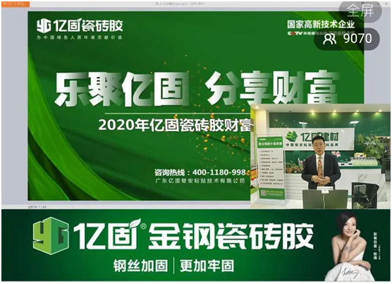 2020年3月28日19:30—21:00,億固瓷磚膠成功舉行了以主題為“樂聚億固,分享財富”的線上直播財富分享會。好品牌、好項目、好政策,短短90分鐘成功吸引了全國9000多名建材精英們參與,32名客戶達成合作意向。