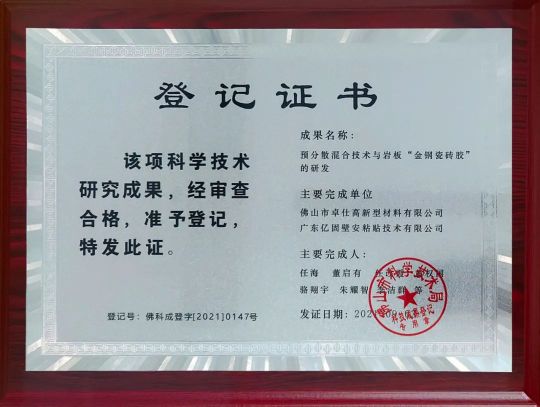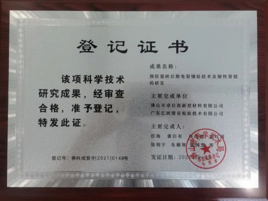 企業(yè)一直以來堅(jiān)持技術(shù)創(chuàng)新,推進(jìn)智能化制造,走高質(zhì)量發(fā)展之路。近年來,與多家科研院校開展產(chǎn)學(xué)研合作,科研成果累累。2021年,由佛山市卓仕高新型材料有限公司、廣東億固壁安粘貼技術(shù)有限公司聯(lián)合承擔(dān)的兩項(xiàng)科研成果通過鑒定。
