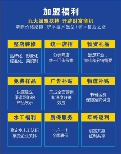 原裝進(jìn)口管業(yè)品牌德國(guó)九盛實(shí)力雄厚,對(duì)合作伙伴的支持力度大!加盟德國(guó)九盛可尊享9大服務(wù)支持,還有專(zhuān)業(yè)、有溫度的策劃團(tuán)隊(duì)與您一起撬開(kāi)強(qiáng)大市場(chǎng)份額!