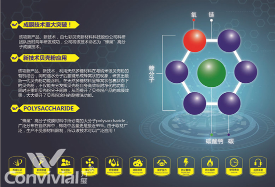 這項新產(chǎn)品和新技術(shù)由七彩貝殼公司科研團(tuán)隊開發(fā)了兩年,萬璽將這項技術(shù)命名為“蜂巢”高分子成膜技術(shù)。新產(chǎn)品和新工藝?yán)锰烊欢嗵遣牧虾图{米級貝殼粉的有機結(jié)合,以及遇水分子氫鍵形成蜂窩的現(xiàn)象,開發(fā)出全新一代貝殼粉功能涂料。天然多糖材料蜂窩狀包裹狀態(tài)的貝殼粉不但能充分利用貝殼粉自身的高效吸附和純化功能,還能重組貝殼粉的分子間隙,進(jìn)而增強產(chǎn)品的成膜效果,大幅提高貝殼粉涂層的耐擦洗功能。