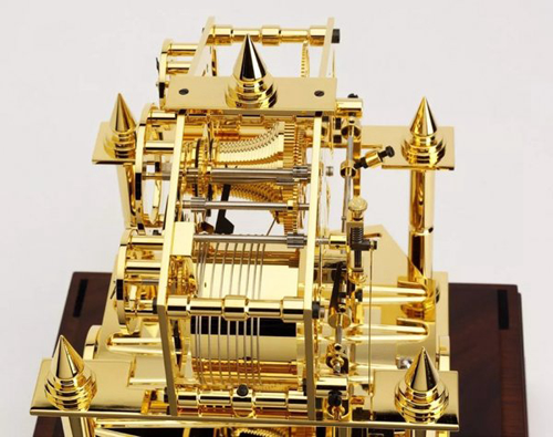 富麗堂皇的桃花心木底座之上,水晶透明斜邊玻璃罩之中,是璀璨奪目而不落俗套的走珠鐘主體:手工打造全黃銅24K鍍金機芯,機械鐘界“超小”鐘面與其他齒輪零部件融為一體,似乎在宣告自己戰火中出生的傳奇身世,豈是那些安居于民宅的普通機械鐘可比。