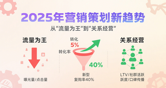 在數字化浪潮席卷全球的今天,營銷領域正經歷著一場深刻的變革。2025年,營銷策劃正逐步告別過去單純追求流量的時代,轉向更加注重建立和維護客戶關系的"關系經營"模式。這一轉變不僅反映了市場環境的成熟,也體現了消費者需求的升級,更預示著企業營銷戰略的全面革新。面對信息飽和的時代,營銷需要從喧囂中找到新的節奏,重新定義什么是真正的連接和價值。