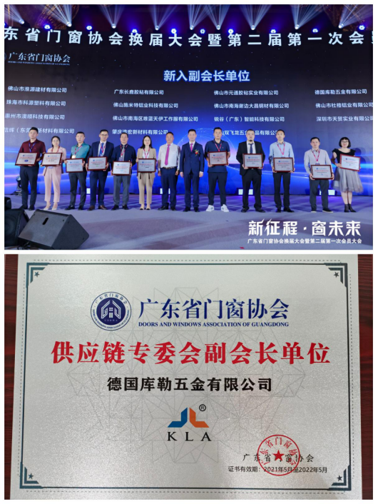 在本次大會現場上,廣東省門窗協會通過選舉的方式,選舉了新增理事、副會長單位。隨后,當即在會議現場宣布選舉結果,公布了新增會員名單,并舉行了授牌儀式。其中,德國庫勒五金憑借多年精耕細作,以細節成就品質的匠心精神,成就了五金行業佼佼者的地位。其在新產品、新技術、新材料、新工藝上不斷精益求精,腳踏實地、銳意進取,持續推動五金產業的崛起,為行業的高質量發展及協會建設做出了應有的貢獻,受到了業界人士的廣泛認可,連續兩年獲得“供應鏈專委會副會長單位”授牌。