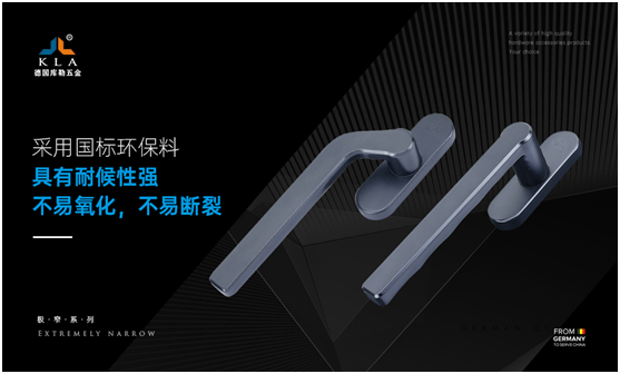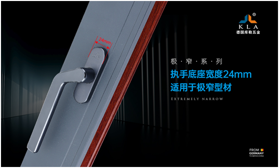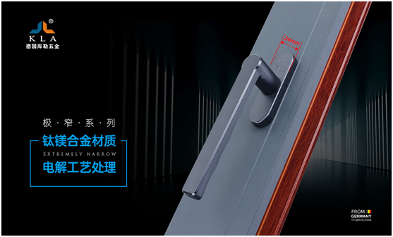 庫勒五金極窄系列執手,手柄部分的材料是采用鈦鎂合金制作而成的,銑邊設計,棱角分明,造型優美;執手底座的寬度為24mm,適用于極窄型材,主要采用國標環保料作為原材料,使成品具有耐候性強、不易氧化、不易斷裂等優點。此外,其底坐采用四孔同線設計,使鎖座底部牢牢固定在極窄的空間里,不返松、經久耐用,避免了開啟不順的問題。在制作工藝上,極窄系列執手采用沙面電解進行表面處理,電解工藝成熟,色澤高端,讓執手顏色質保十年不變!