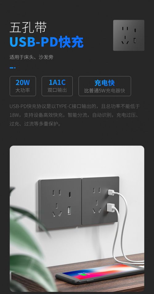 設(shè)計(jì)師將美感與功能兼顧其中。創(chuàng)新五孔設(shè)計(jì),倡導(dǎo)新的生活方式:更實(shí)用,更新穎。新五孔不僅有插座功能,還有其他的功能。(1)五孔+20W大功率快充,適合安裝在床頭、沙發(fā)旁;(2)五孔+小夜燈,適合安裝在床頭;(3)五孔+感應(yīng)地腳燈,適合安裝在走廊、過(guò)道;(4)五孔+閱讀燈,適合安裝在床頭,書(shū)房。功能強(qiáng)化后的五孔,大大提升人們?nèi)粘I畹谋憷浴?/p>