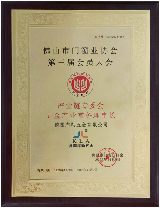 作為佛山市門窗業(yè)協(xié)會的會員企業(yè),德國庫勒五金始終積極參與到協(xié)會的各項活動中,支持并推動協(xié)會的發(fā)展。此次榮獲“產(chǎn)業(yè)鏈專委會常務理事長”稱號,更是表明了庫勒五金在門窗行業(yè)內(nèi)的領導地位和影響力。