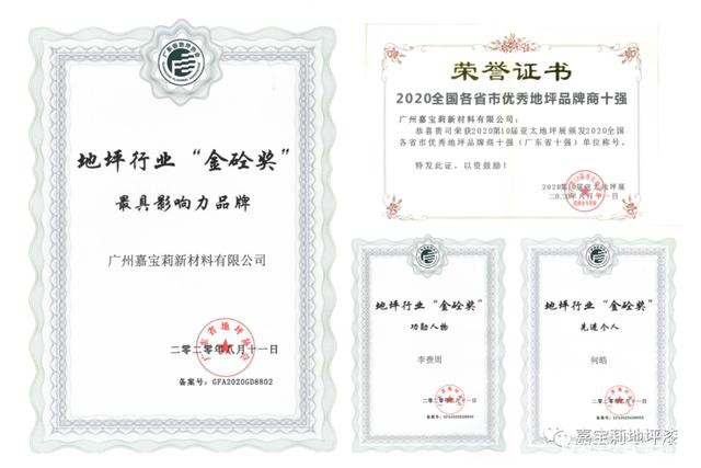 8月11日,廣東省地坪協會成立五周年慶祝大會隆重召開,對行業內有突出貢獻的企業和人物進行表彰,廣州嘉寶莉新材料有限公司摘獲3項大獎,嘉寶莉品牌榮獲地坪行業“金砼獎”最具影響力品牌,總經理李賚周、市場總監何皓分獲地坪行業“金砼獎”功勛人物及先進個人獎。廣州嘉寶莉新材料有限公司同時榮登在同期舉行的2020年地坪品牌商十強行列。