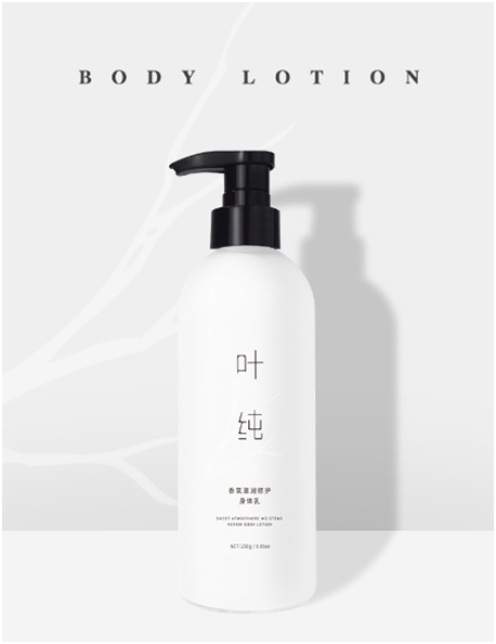 葉純香氛身體乳,白色的橢圓形瓶子,不做無意義的色彩,不添加無意義的成分,不妥協,不迎合,無添加,將純凈護膚堅持到底。讓每一滴護膚品、每一分活性物都能發揮它應有的作用,讓消費者的每一分錢都能夠物超所值,這就是葉純所做的。品牌堅持以天然純凈之物潤澤肌膚與秀發,以自然能量平衡自我,給予每一個熱愛生活的您帶來身心的深度滋養和能量的提升。