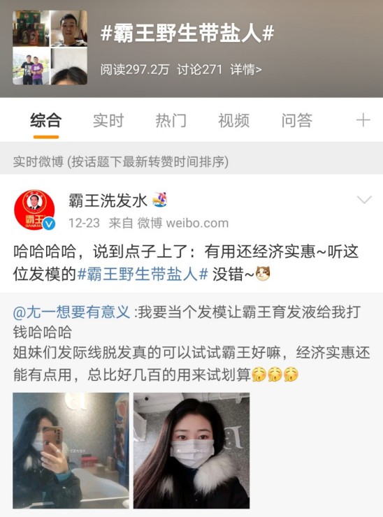 微博是年輕人的聚集地,霸王化名“本王”活躍在互聯網上,出現在曬單的“野生代鹽人”的微博里也出現在大學生調侃禿頭的熱搜里。用年輕人的梗跟年輕人對話,是霸王守住微博宣傳口的重點,歡迎大家關注“霸王洗發水”微博,和“本王”互動!