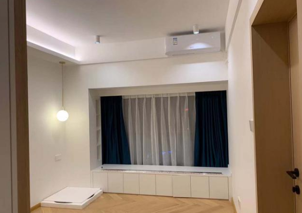 臥室的飄窗也改造成收納柜了,區別于客廳的中央空調,臥室只選擇了壁掛空調機,符合一貫的風格,該簡潔的地方從不鋪張,而且為了簡潔也可以做得有點復雜。