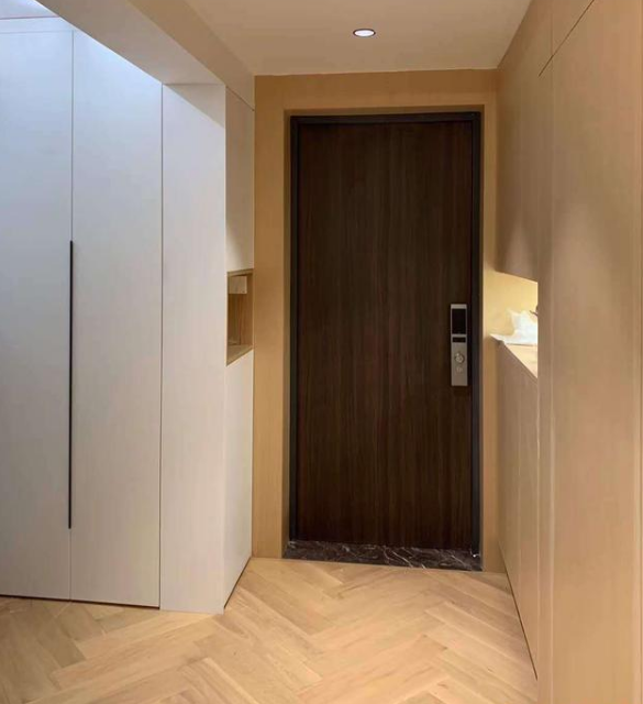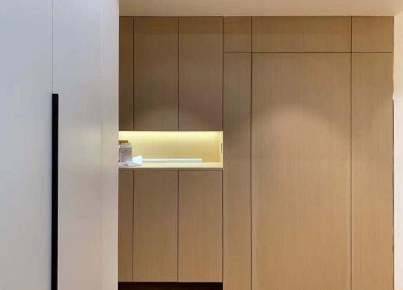 夜晚回家一進門看到是,鞋柜和收納一體柜的上溫馨的燈光,一般人注意不到邊上的隱形門設計。