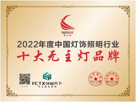 此次評選活動秉承一貫的客觀、公正、公平原則,遴選出致力于品牌建設的優秀燈飾照明企業,專業燈具市場以及物流企業。近千名專家評審團打分、評選、簽字、蓋章,經過層層嚴格評選,鋒磁天下榮獲亮點獎“2022年度中國燈飾照明行業十大無主燈品牌”!