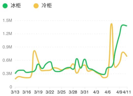 微信指數(shù)顯示,自4月7日以來(lái),關(guān)鍵詞“冷柜”的熱度呈現(xiàn)大幅上升趨勢(shì);關(guān)鍵詞“冰箱”更是在4月10日達(dá)到近30日的高點(diǎn)。