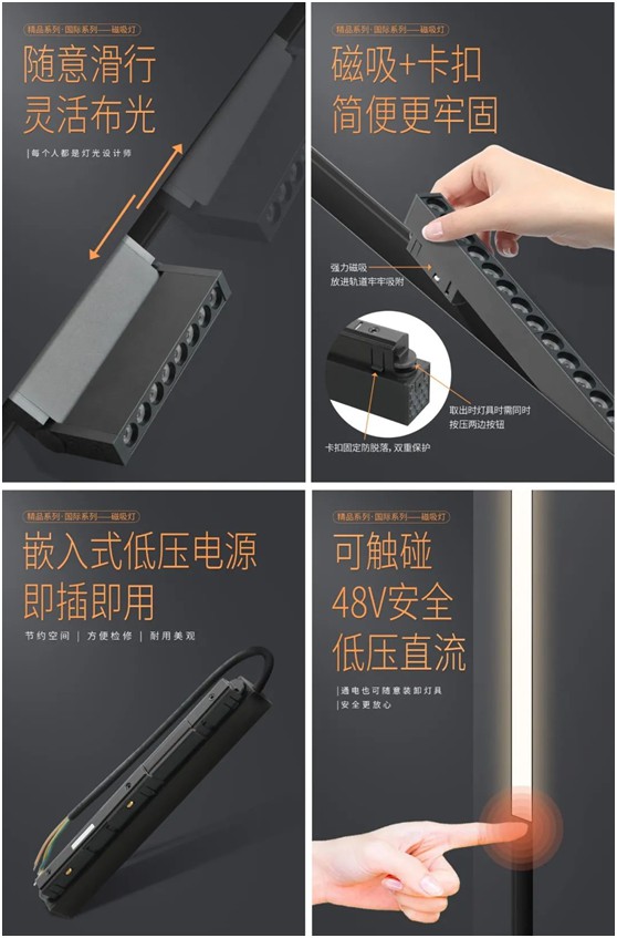 1、磁吸卡扣,拆卸方便:開爾精品·國際磁吸燈采用磁吸+卡扣設計,雙重穩固,無需擔心磁吸力不夠,燈會掉下來。只需鋪設好軌道,燈具安裝、取下可一秒搞定。