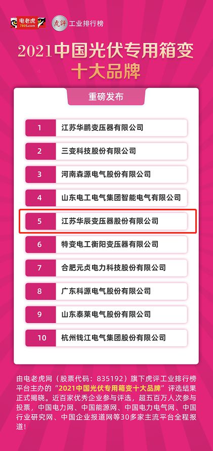 近日,由電老虎網旗下“虎評工業排行榜”主辦,多家權威媒體、各級行業協會共同發起的“2021中國光伏專用箱變十大品牌”與“2021中國風電專用箱變十大品牌”榜單正式揭曉。江蘇華辰變壓器股份有限公司分別榮登這兩份榜單的第五名與第四名!該系列排行榜在行業內擁有巨大的影響力,傳播廣泛、影響深遠,得到業界高度認同,被譽為中國電力電氣行業的“金雞百花獎”。