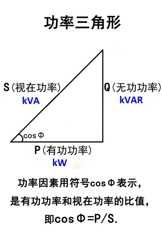 有功功率、無(wú)功功率和視在功率,它們存在一種三角函數(shù)關(guān)系,cosΦ稱為功率因素,也就是有功功率和視在功率的比值,即cosΦ=P/S. 這個(gè)值有助于我們正確選擇變壓器容量大小。