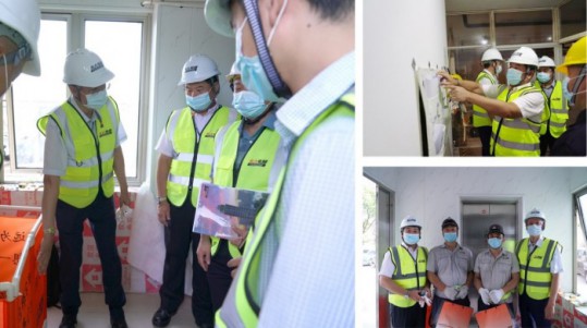為貫徹落實(shí)日立集團(tuán)安全文化,永大電梯高層領(lǐng)導(dǎo)持續(xù)開(kāi)展項(xiàng)目的安全隱患排查,并關(guān)懷高溫天氣奮斗在一線的工作人員。7月6日,在永大電梯維保與安裝總部沈琦總經(jīng)理的陪同下,金原慶武總裁、汪安國(guó)執(zhí)行副總裁等領(lǐng)導(dǎo)一行來(lái)到上海松江泗涇鎮(zhèn)大名公寓加裝電梯現(xiàn)場(chǎng)以及上海錦豐國(guó)際大酒店舊梯現(xiàn)代化更新改造與維保現(xiàn)場(chǎng)走訪,調(diào)研疫情與高溫雙重壓力下一線工作的開(kāi)展情況。