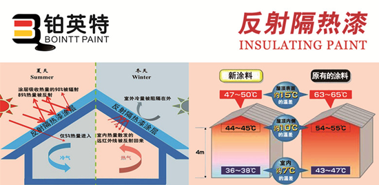 鉑英特反射隔熱漆是由高品質(zhì)進口乳液,配以優(yōu)質(zhì)反射隔熱因子助劑、顏料及功能性填料等制成,通過高效反射太陽光來達到隔熱目的。