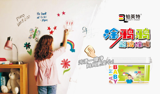 每一個孩子都是人間的小天使,他們善良純真、富有童趣。面對孩童與生俱來的玩樂能力,墻面就是他們最初的“創作園地”。在手印、鞋印、果汁、水漬的“到此一游”里,家長的顧慮應運而生。為了在滿足孩子釋放天性的同時,解決家長的后顧之憂,鉑英特結合I級抗污和凈化甲醛技術,研發出了“涂鴉鴉”兒童漆,進一步呵護孩子健康。