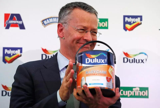 阿克蘇諾貝爾現任CEO范迪睿在英國阿興頓新涂料工廠開幕典禮上展示Dulux產品。阿克蘇諾貝爾利用收購ICI繼承了正統的Du