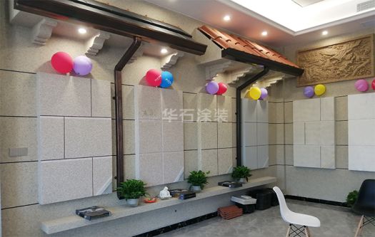 華石涂裝婺城旗艦店整店的裝修沿用了旗艦店面的設計風格,全店皆采用仿石涂裝,搭配別墅常用的裝飾構件,店內精美的藝術畫和別致的燈飾,更讓高端大氣的店面散發著強烈的藝術氣息。