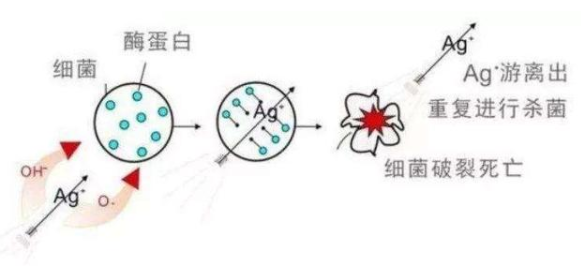 現階段有諸多的已知金屬離子都是有抗菌殺菌功能,最人們所熟悉的便是銀。當銀離子在與細菌觸碰反應后,造成微生物原有成分破壞或發生功能障礙。當微量的銀離子到達微生物細胞膜時,因后者帶負電荷,憑借庫侖引力,使二者堅固吸附,金屬離子透過細胞壁進入細胞內,并與巰基(-SH)反應,使蛋白質凝結,破壞細胞合成酶的活性,細胞喪失分裂繁殖功能而死亡。