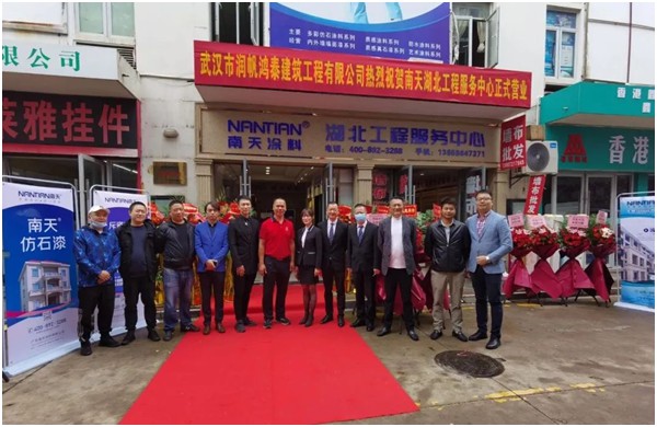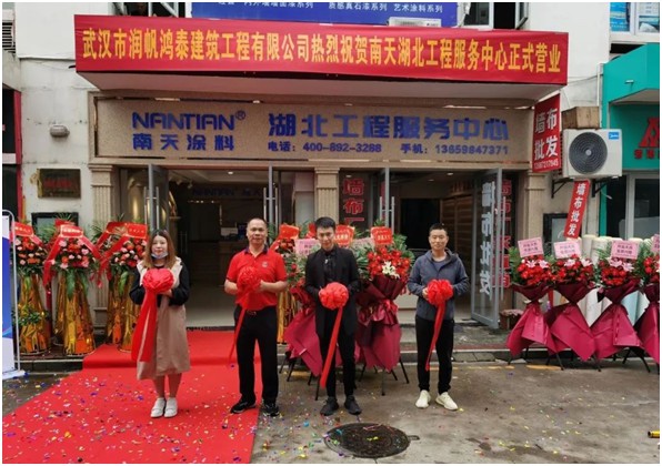 此次是南天涂料繼安徽創建生產基地后迎來的雙重喜訊,活動當天南天涂料董事長張銓秋、銷售總監祝健輝,武漢市潤帆鴻泰建筑工程有限公司董事長蔡帆等領導親臨開業典禮并參與了剪彩儀式。
