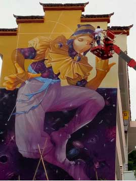 此次創作沿襲了其以往的作品特色,在160平米的巨型墻面上,一個身著歐洲傳統服飾的小丑躍然出現在畫面中,體現出狂歡節的熱鬧歡騰。小丑周圍圍繞著宇宙星辰,整幅畫面呈現出一半“日光”,一半“暗夜宇宙”的沖突美感。當談及為何使用宇宙元素時,INTI表示:“中國是世界上產生天文學最早的國家之一,天文對于宗教文化的傳承也有深刻的影響。我們都是宇宙的一部分,雖然我們有不同的文化信仰但是我們被同一個星辰所牽連,這就是天文的魅力。同時我希望這幅畫可以啟迪孩子對于未知世界的探索想象力,打開他們內心的求知大門,幫助他們擁有創造性的思維”.