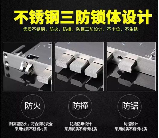 鎖具不一樣,鎖舌數量也許也不一樣,有單鎖舌、多鎖舌之分。有別于單鎖舌,多鎖舌遭受暴力打開時,撬開一個鎖舌,不容易對防盜功能引起致命性打擊。皇家金盾智能鎖主鎖舌均為三鎖舌。有著防鋸、防撞功能,有效防止暴力開鎖。