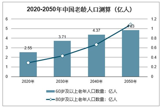 據《2019-2025年中國老年健康服務行業市場全景調查及投資方向研究報告》數據顯示:2018年末中國60歲及以上人口已達24949萬人,占17.9%,未來中國老齡人口仍將進一步增加。同時,該報告預測到2020年我國60歲及以上老年人口數量將達到2.55億人,80歲及以上老年人口數量也將達到0.29億人。