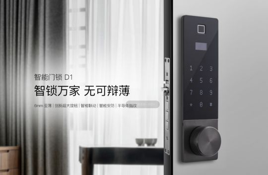 智能門鎖D1厚度僅有6mm,無按壓手柄設計,指紋解鎖一按即開,大旋鈕的設計更顯大氣。