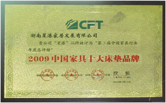 此次星港家居憑借頗具核心競爭力的產品和廣泛的知名度,在“第三屆家具行業年度總評榜中”榮膺“2009中國家具十大床墊品牌”稱號可謂實至名歸!