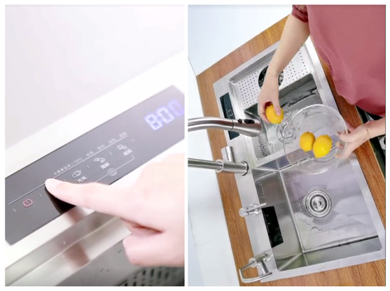 NQ826多功能雙重凈化水槽,率先在國內運用領先的生鮮食品無毒凈化技術——羥基水裂解凈化技術。該技術無添加、不溢散,取材于水,還原于水,做到真正綠色清潔,填補了水槽行業綠色無毒凈化的空缺。輕觸上方的雙觸媒,選擇對應的食材清洗模式,開始食材的清洗旅程,能夠有效去除農殘、細菌、激素等有害物質。只需1分鐘,果蔬清洗完畢,即可入口,食材清洗又簡單又享受。智能化水槽滿足現代人快節奏的生活和追求健康的美好愿景,全面提升用戶體驗。