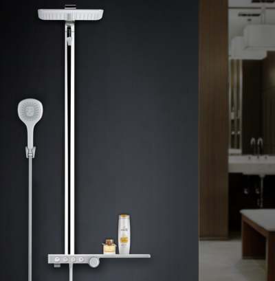 恒潔雨沐花灑采用人性化的實用設計,置物面板上設計了功能按鈕,從左至右分別為下水龍頭、頂噴花灑、手持花灑、一鍵暫停按鈕,可以根據需要同時開啟1種到3種功能,且能直觀明了地清晰分辨哪種功能正在工作,誤判的尷尬從此不會再有。最右邊的恒溫旋鈕解決了沐浴時水溫冷熱不均的問題,旋鈕內部設置恒溫棒,能通過對冷、熱水的進水量控制來保證出水恒溫。一般情況下,旋鈕自動停留在中間38℃人體沐浴最舒適的溫度之上,同時也可根據個人需求進行調節:往右旋轉輕松調低溫度,按住旋鈕下方的童鎖按鈕同時往左旋轉能調高溫度,童鎖按鈕則考慮到防止小孩誤操作導致燙傷。