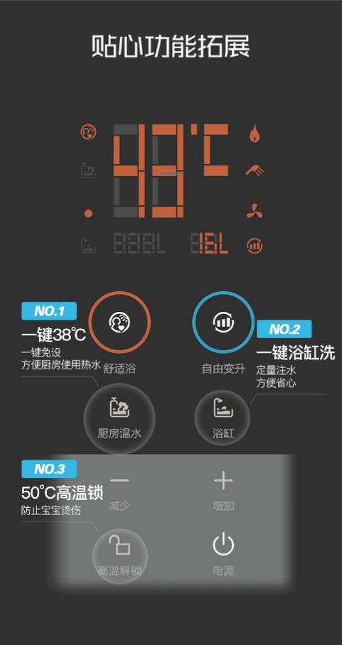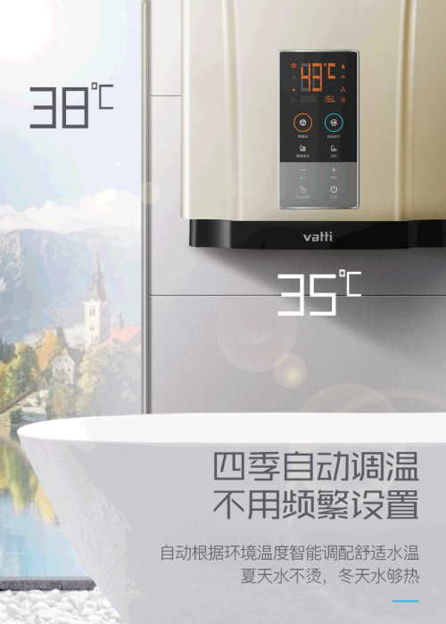 華帝i12034智能恒溫燃氣熱水器,具有一鍵式舒適洗浴功能和一鍵式確認功能,不僅適用于春、夏、秋、冬四季,即使早、中、晚三季溫差很大,也不需要立即調節水溫。內置智能中央處理器將根據接收到的環境溫度監控自動給出最舒適的水溫,不再需要手動調節水溫。