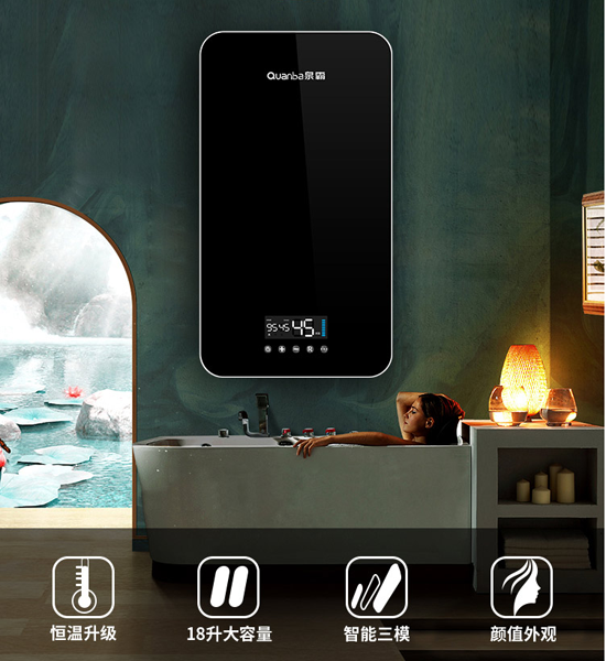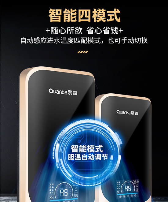 以泉霸恒溫速熱式電熱水器為例,其具有高、中、低、智能模式,四種模式可用于根據季節變化智能調節內膽溫度,也可手動設置。根據季節變化,可以設置驗證模式,實現快速補熱,減少熱能浪費。沐浴時更加無憂,5500w快速補熱系統可以成倍增加熱水器的出水量,滿足家庭沐浴的舒適需求。實現多倍容量、小尺寸和大容量!