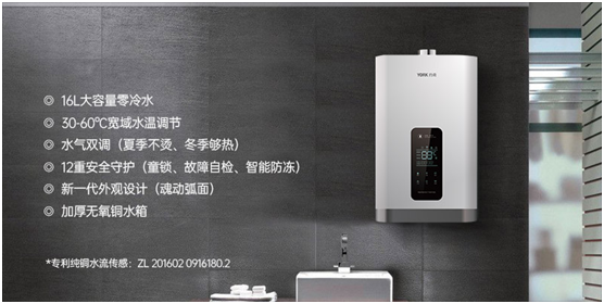 ②“水氣雙調”技術。通過植入的約克智能芯片,綜合分析熱水器的進出水溫度、水流量、氣壓等變量,精準運算其所需火力和風機轉速的高低,自動調節比例閥開度以增加或者減少熱負荷反應,使水溫始終恒定如一,并實現高效利用燃氣能源。