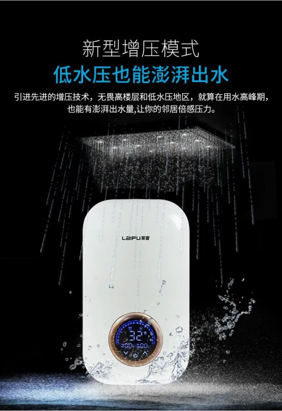 現在的商品房為了提高土地使用率,通常樓層很高,而這樣做導致的后果就是洗澡時要么水流很小,要么就是沒有水。而萊普即熱式熱水器采用新型增壓模式,低水壓也能澎湃出水,無畏高樓層和低水壓地區限制。