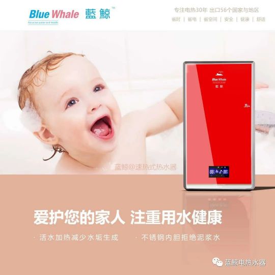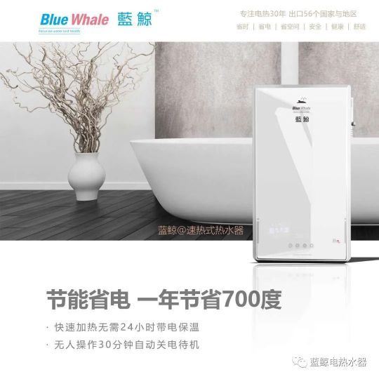 藍鯨速熱式電熱水器,春夏秋季節可快速加熱,冬天預熱3至10分鐘,便能有恒溫熱水供應,十分快捷方便,不受洗浴人數限制,滿足時下人們快節奏的生活節奏。