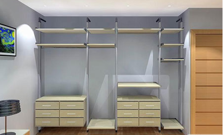 由立柱與板材組合而成。立柱主要是由鋁錠壓鑄而成。其鋁成份純度高、硬度強,不但保證整個框架穩固不搖晃,更能保證永不變形。表面采用陽極氧化技術,保證氧化層不脫層,光滑無砂粒、無凸點。框架衣柜采用歐洲流行的菱形方式卡位連接。不但給人有鋼木結合的新潮感,而且整體穩定性強。可自由調節高低和隨意改動層板,滑槽不留絲毫痕跡,適合不同季節因服裝變化因致所需要的收納空間的變化。各種不同功能的配件設計,增加了分類的靈活性,便于衣物的歸類,使整個放置井井有條。