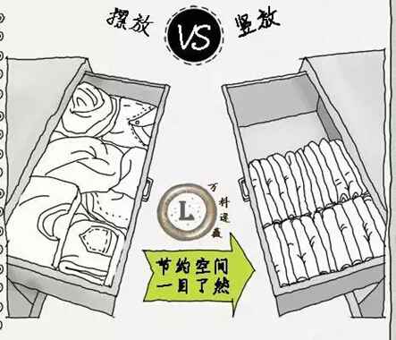 藤麻理惠整理論里最讓人印象深刻的莫過于把衣服折好后豎立起來放置,逯薇在她的圖文中也提到了這個(gè)方法的優(yōu)點(diǎn):節(jié)省空間,存取方便,衣服不容易亂。這種方法對(duì)于小戶型的衣柜特別好用,除了掛衣區(qū),抽屜、隔層都可以收納很多衣服。